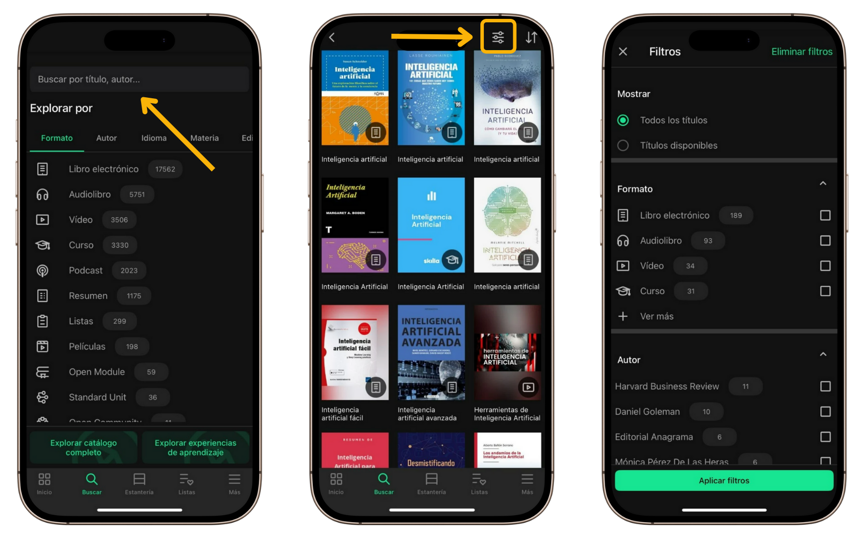 - Usa los filtros desde el icono de ajustes para refinar los resultados.