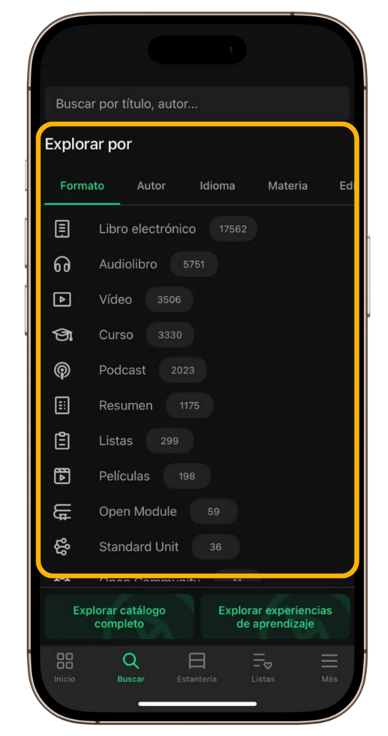 Debajo del buscador encontrarás la sección Explorar por, con pestañas que te permiten hacer búsquedas rápidas: