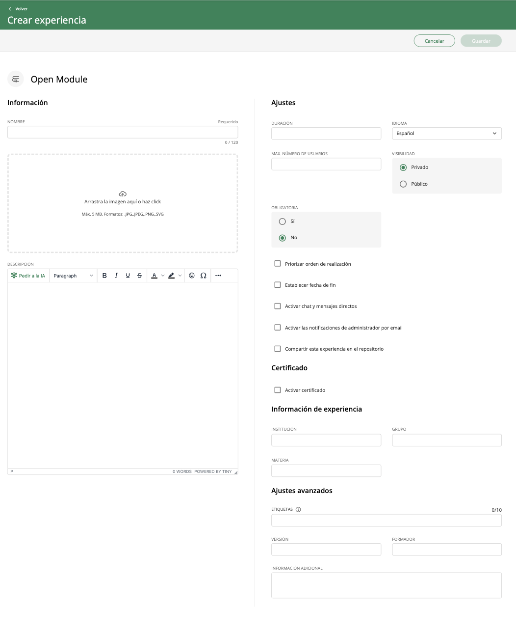 Podrás configurar la experiencia completando los siguientes datos, en este caso se ha elegido la experiencia Open Module: