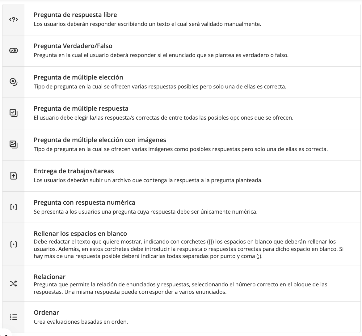 Entre ellas, existen preguntas de Verdadero/Falso, de respuesta múltiple, de ordenar y relacionar conceptos, entre otras.