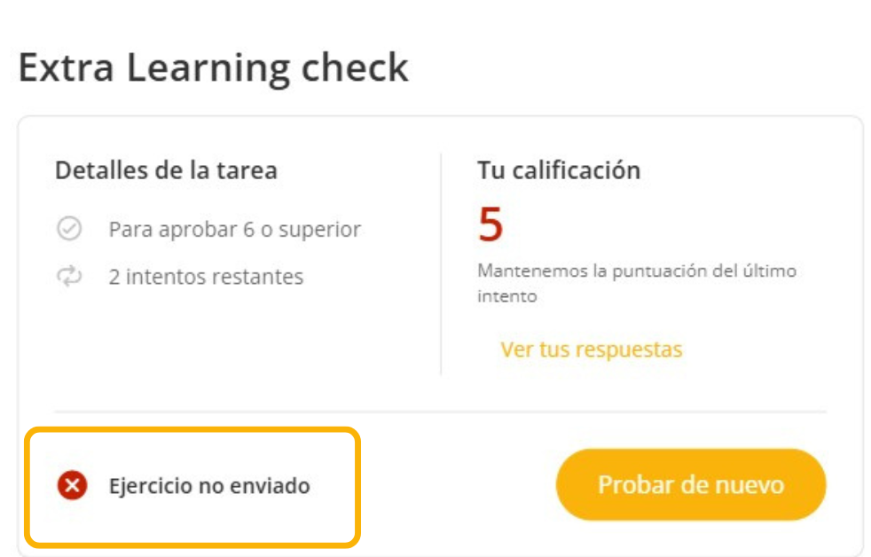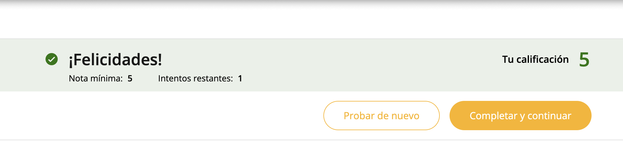 En los ejercicios que permiten varios intentos y requieren una nota mínima, el usuario deberá alcanzar esa puntuación para poder enviar el ejercicio. Si no lo consigue, el botón “Completar y continuar” no estará disponible.