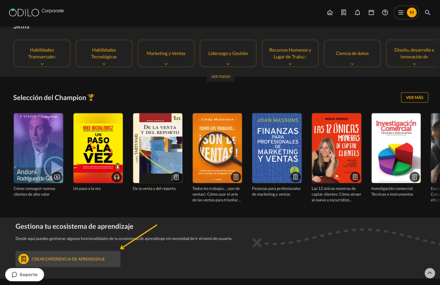 1. Haz clic en “Crear Experiencia de aprendizaje”, ubicado bajo el primer carrusel.