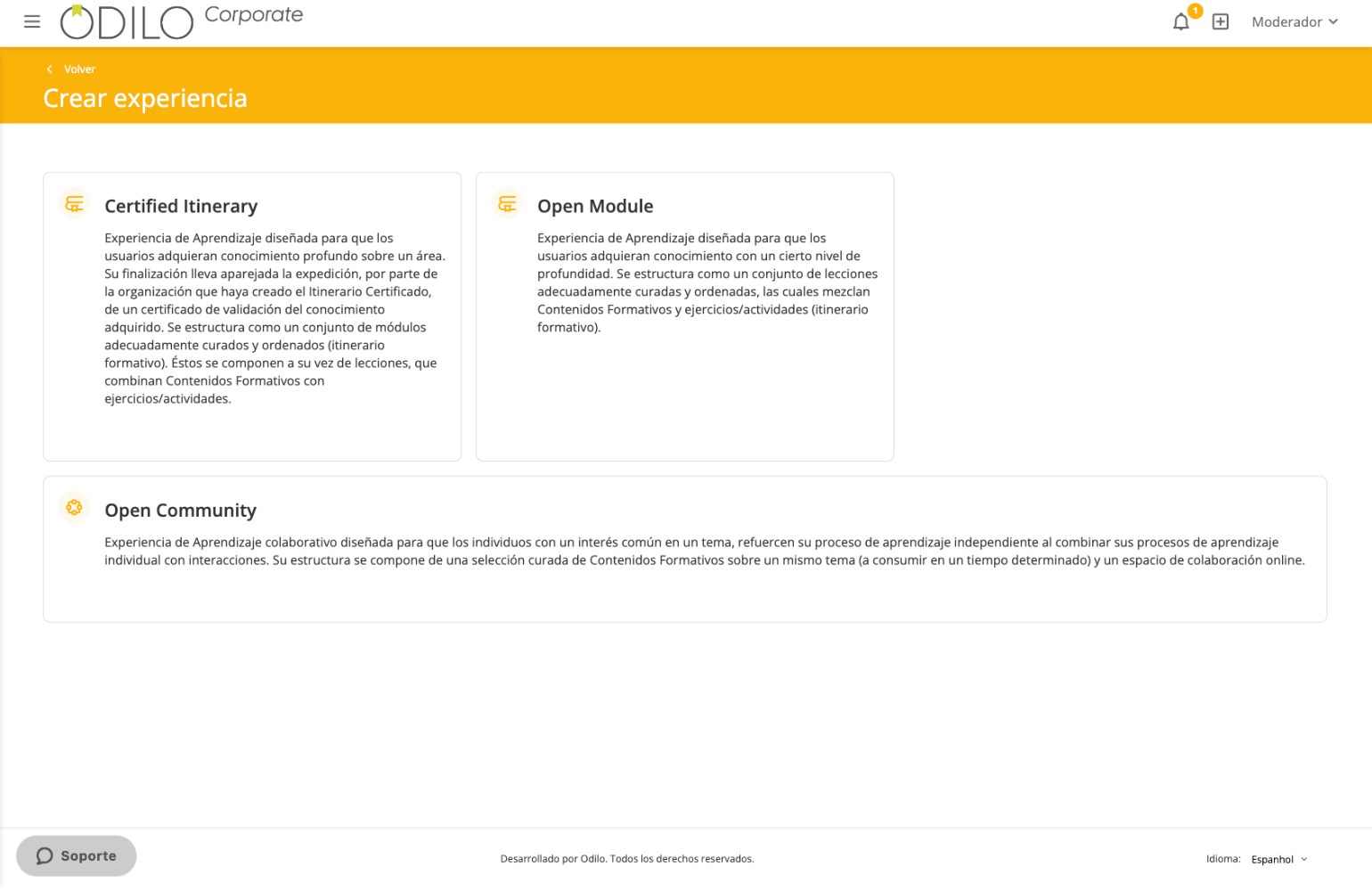 Haz clic en el botón de “Crear experiencia de aprendizaje” que se encuentra bajo el carrusel y elige el tipo de experiencia que deseas crear.