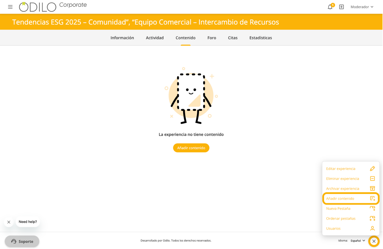 1. Desde la pestaña Contenido, haz clic en “Añadir contenido”, visible en el centro de la pantalla. También podrás acceder a esta opción desde el botón situado en la esquina inferior derecha.