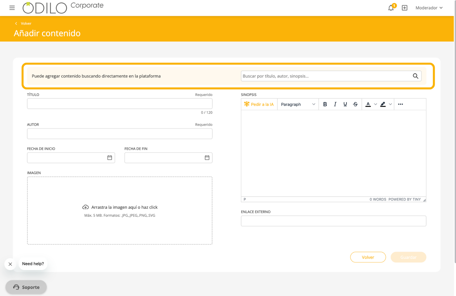- Catalogar un recurso: Sube tu propio contenido a las lecciones a través de esta opción. Para ello, debes completar los espacios de información, título, autor, sinopsis y luego importar desde tu equipo el recurso deseado (soporta formatos pdf, mp3, mp4, epub).