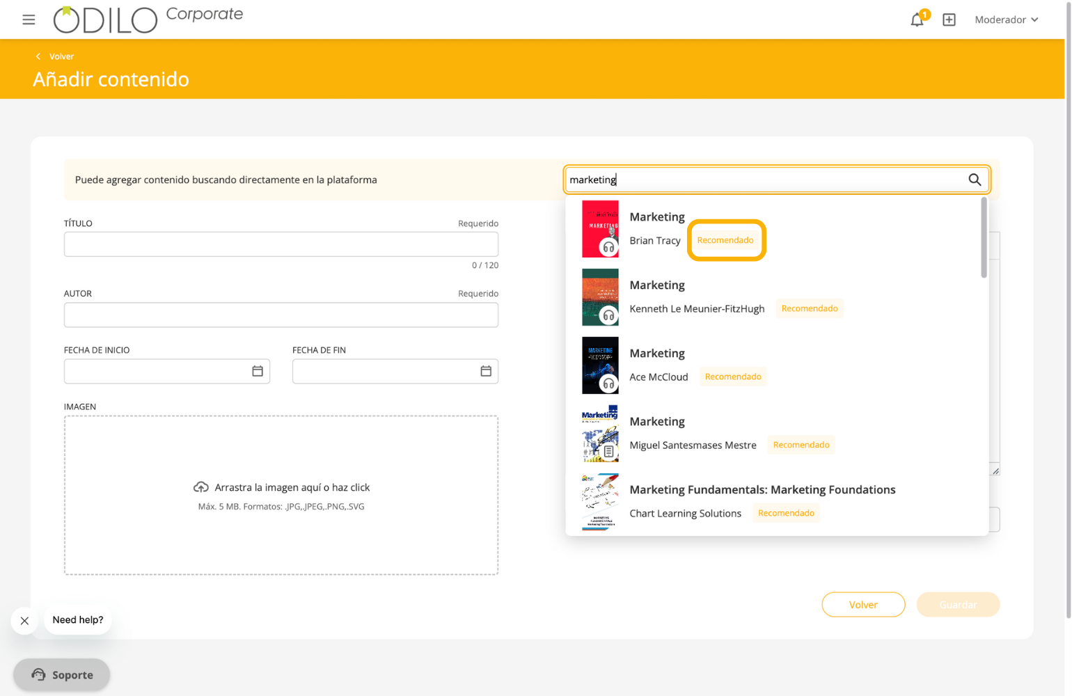 - Buscar un título: Busca un contenido desde el catálogo del ecosistema de aprendizaje escribiendo el nombre del recurso en la barra de búsqueda. Después, si lo deseas, podrás elegir las fechas en que ese contenido estará disponible para el usuario.