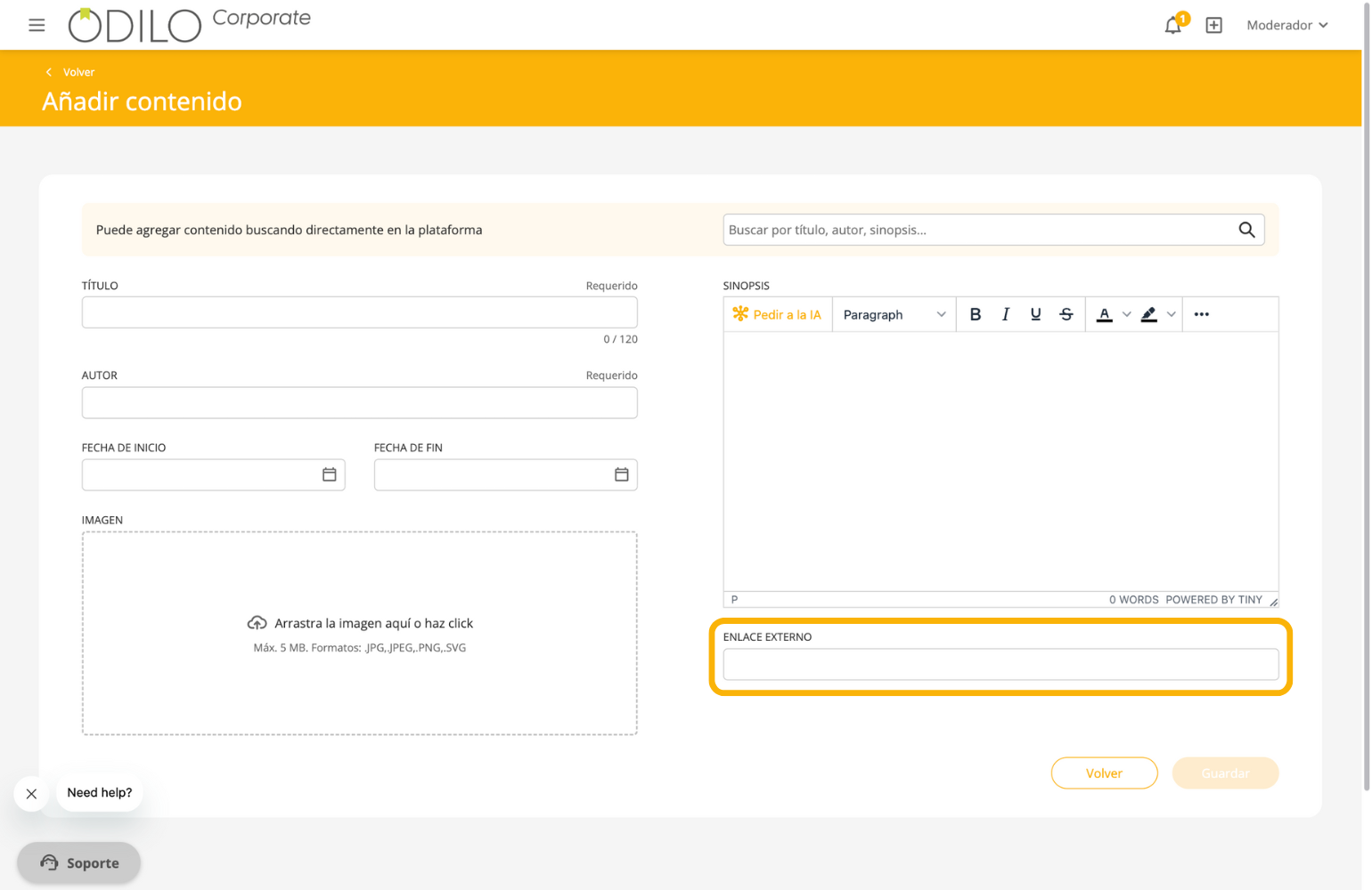 - Inserta el link correspondiente, en el recuadro inferior de “Enlace externo” deberás completar manualmente Título, Autor, Descripción y Portada.