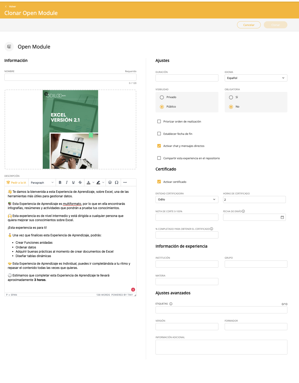 Al hacer clic en “Clonar”, podrás comenzar a configurar tu experiencia según las necesidades de tu organización, indicando la información en los campos requeridos.