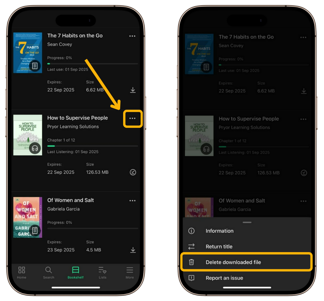 Keep in mind that each download increases the amount of storage space used by the app on your mobile device. If you want to free up space, you can delete a downloaded title. To do so, tap the three-dot icon on the right side of the title entry and select “Delete downloaded file”.