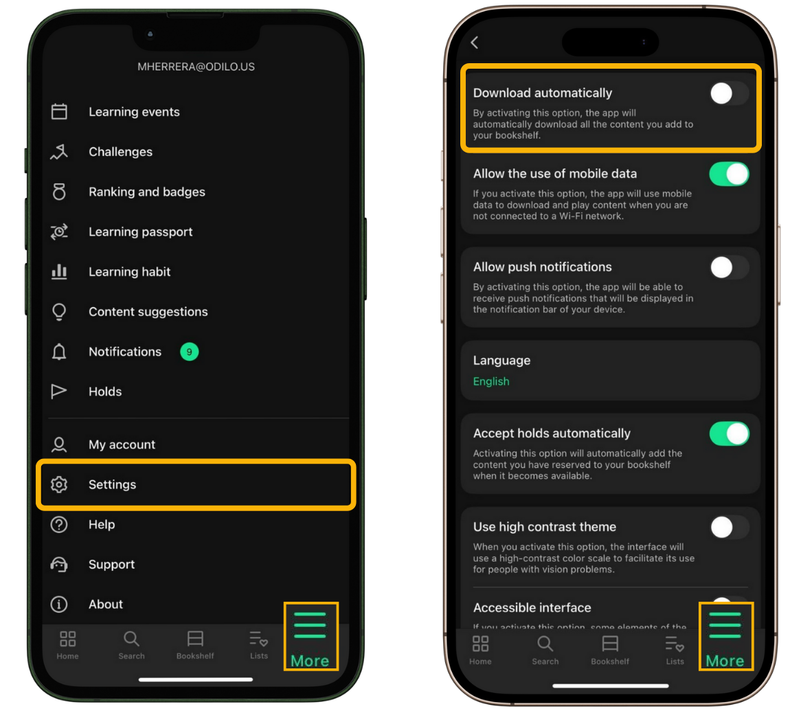 You can configure how resources added to your Bookshelf are downloaded. If you enable automatic downloads, resources will be downloaded to your device as soon as they are added, allowing you to access them offline at any time. By default, the app does not download resources automatically.