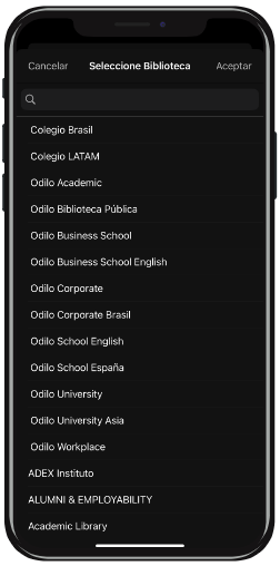 En el caso de que tu institución corresponda con la app Odilo Aprendizaje ilimitado, una vez descargada tendrás que seleccionar el nombre de tu institución, en el recuadro “Selecciona Biblioteca”.